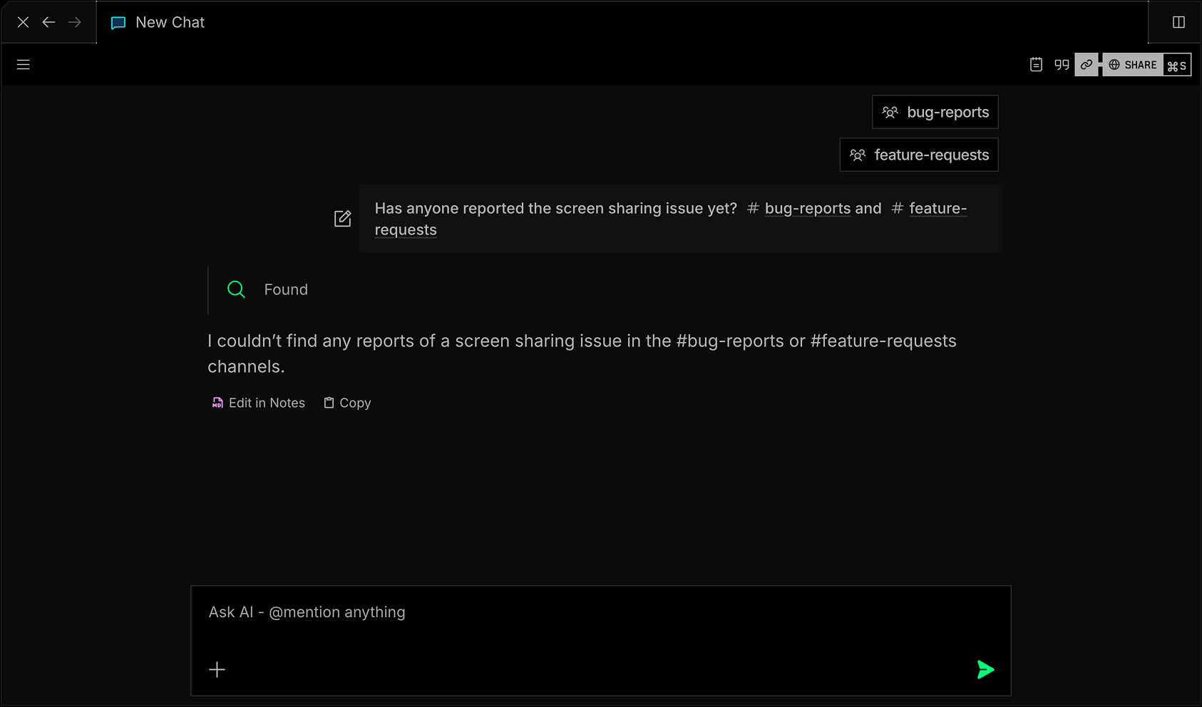 The latest AI models are amazing with right context. @mention messages, files, emails, projects and tasks to manually provide context. Toggle into agent mode and AI can search your emails, messages files.