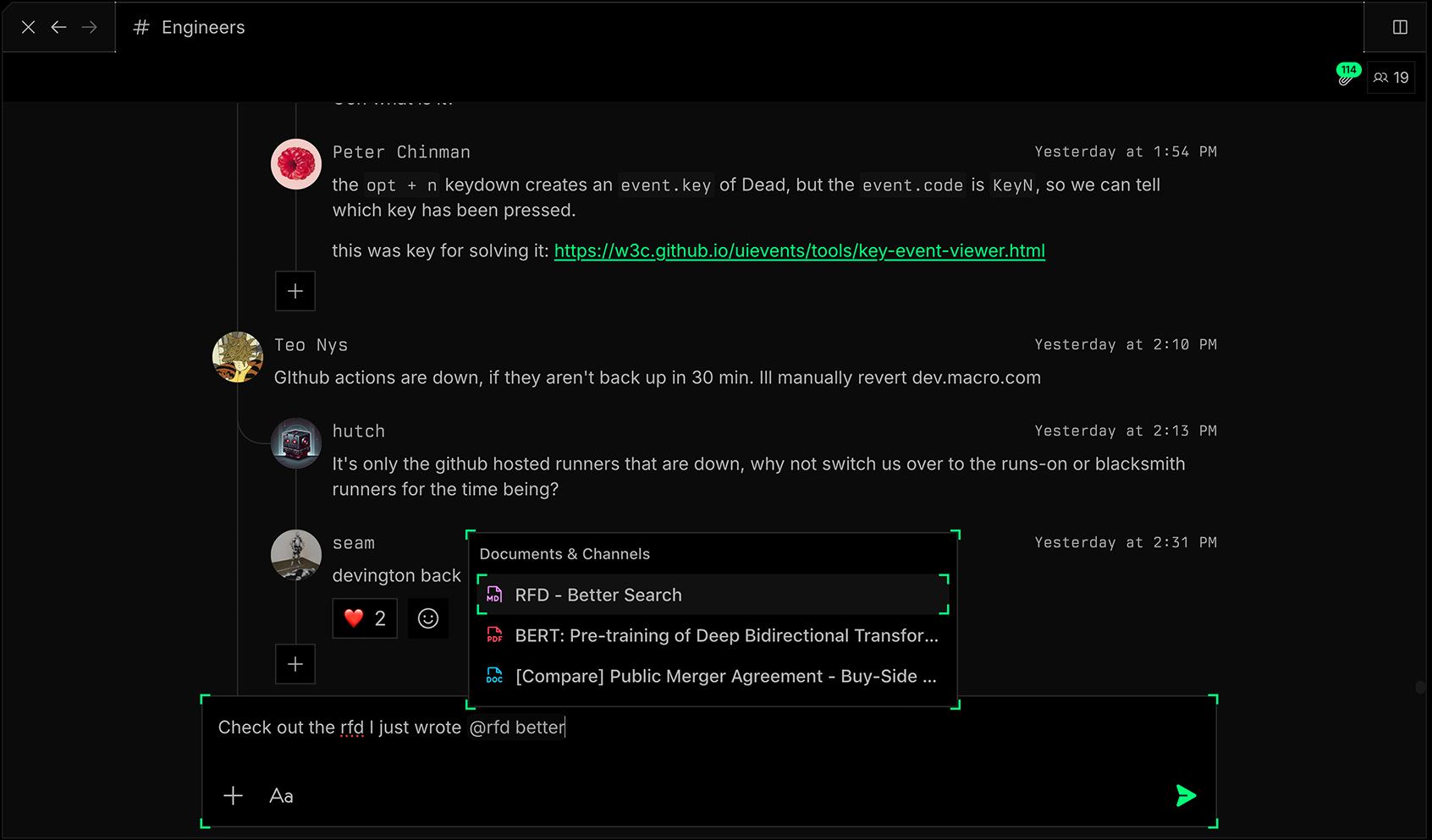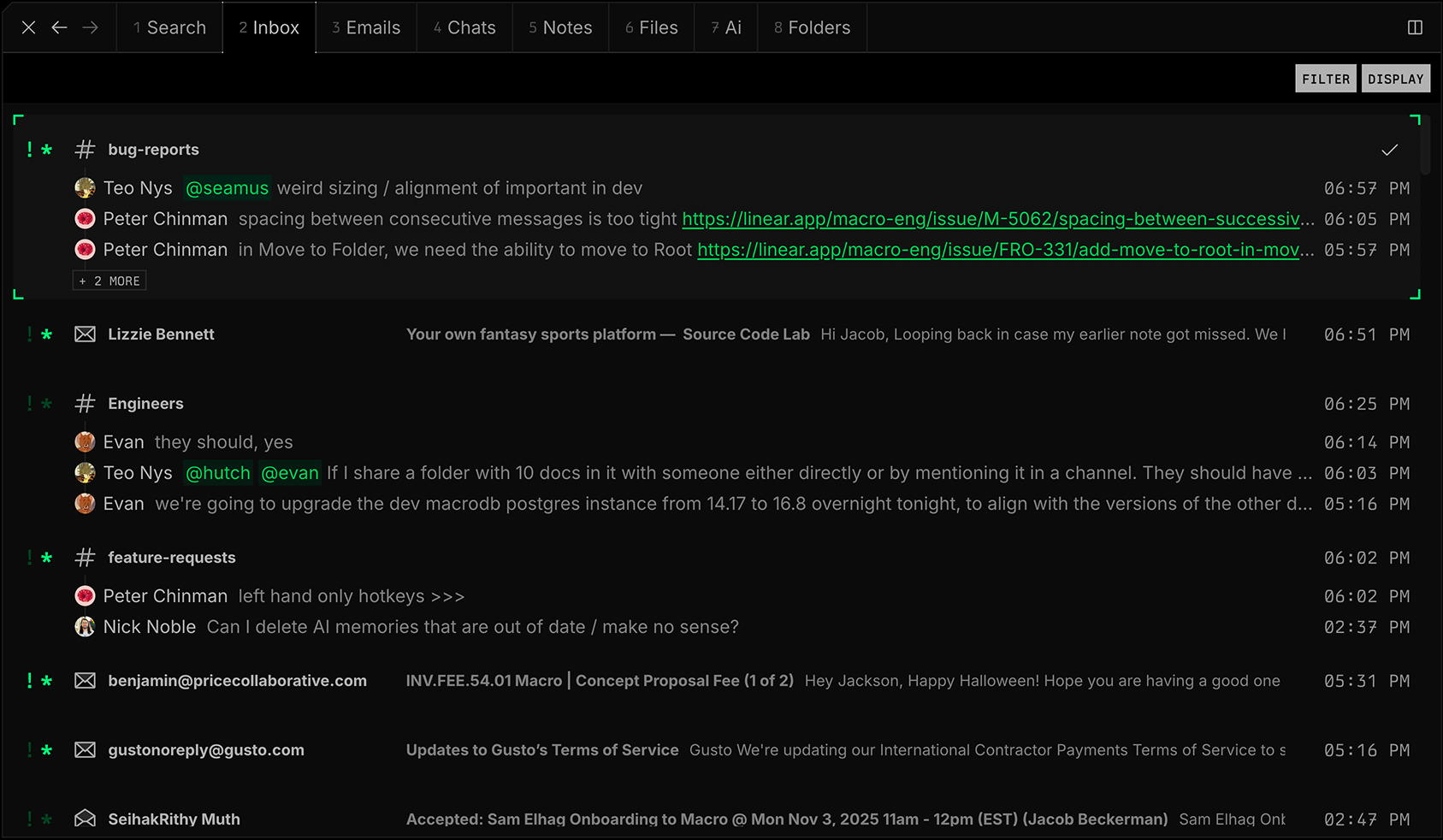 It's hard to say exactly what's wrong with Slack. Is it the constant pings? Too many channels? Macro still has channels, but like Email, it also has an Inbox so don't need to reply right when you open a message.