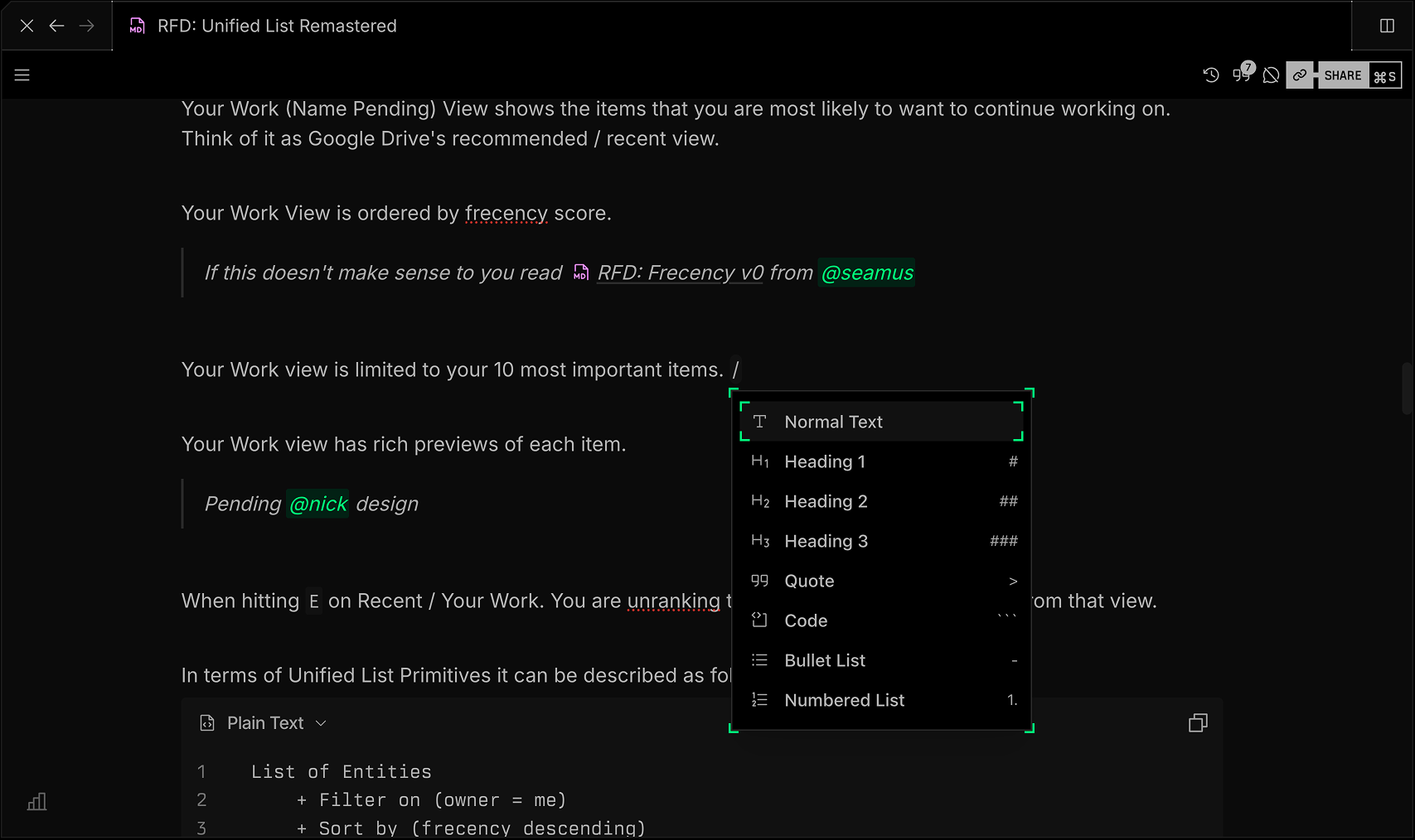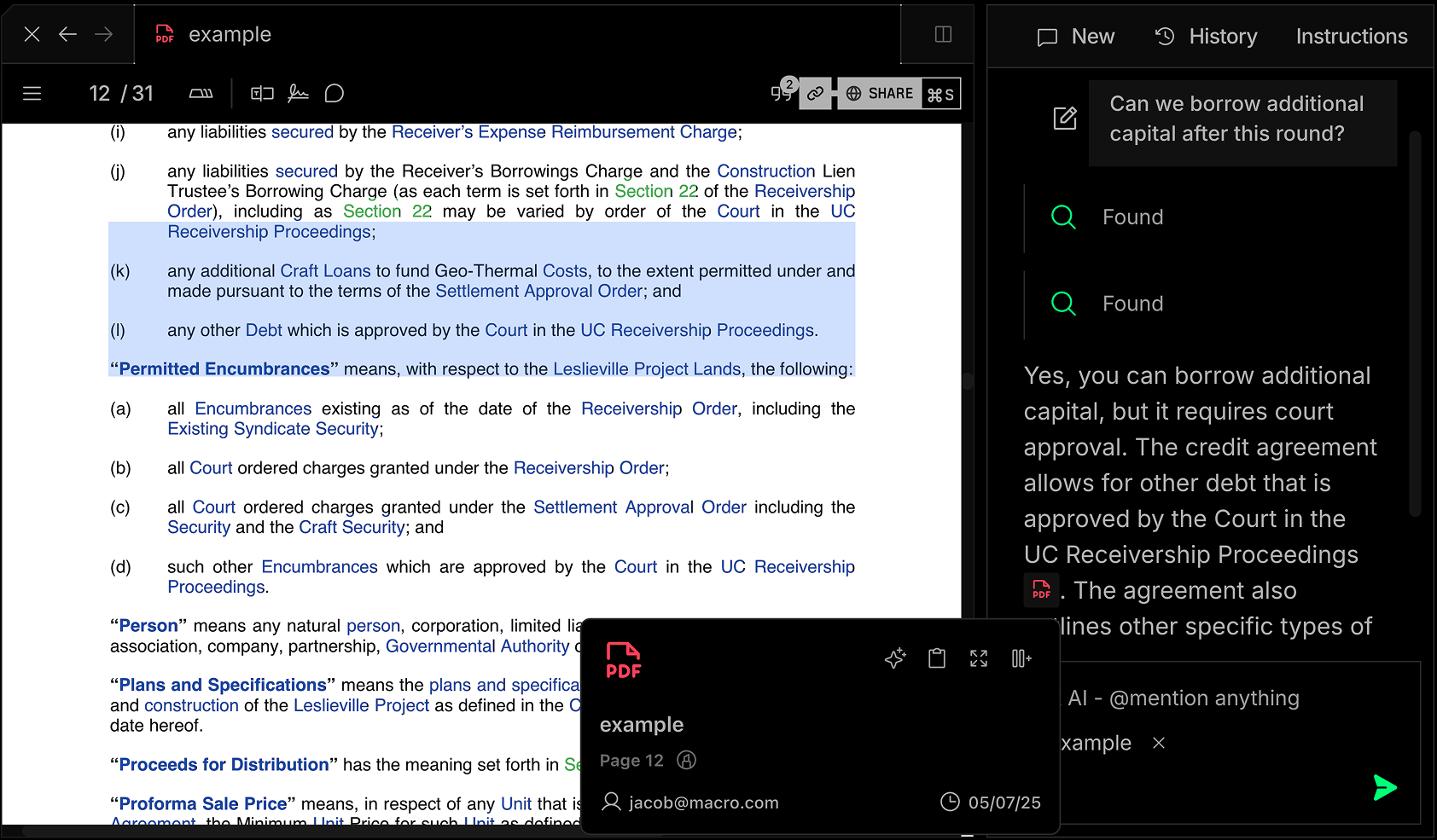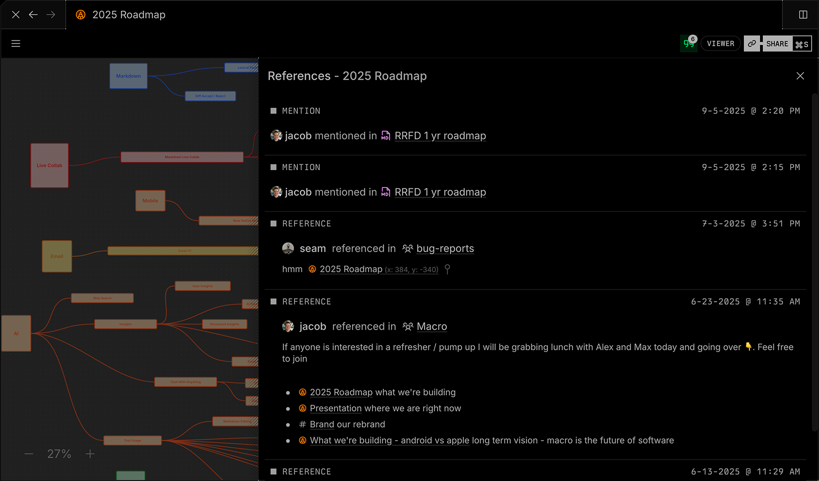 A 2d canvas is often better than a text file, but its harder to keep it up to date. Macro fixes that by deep-linking @tasks @files @emails etc. onto the canvas. Embeds and links auto-update, so your original plans are connected to the actual work.